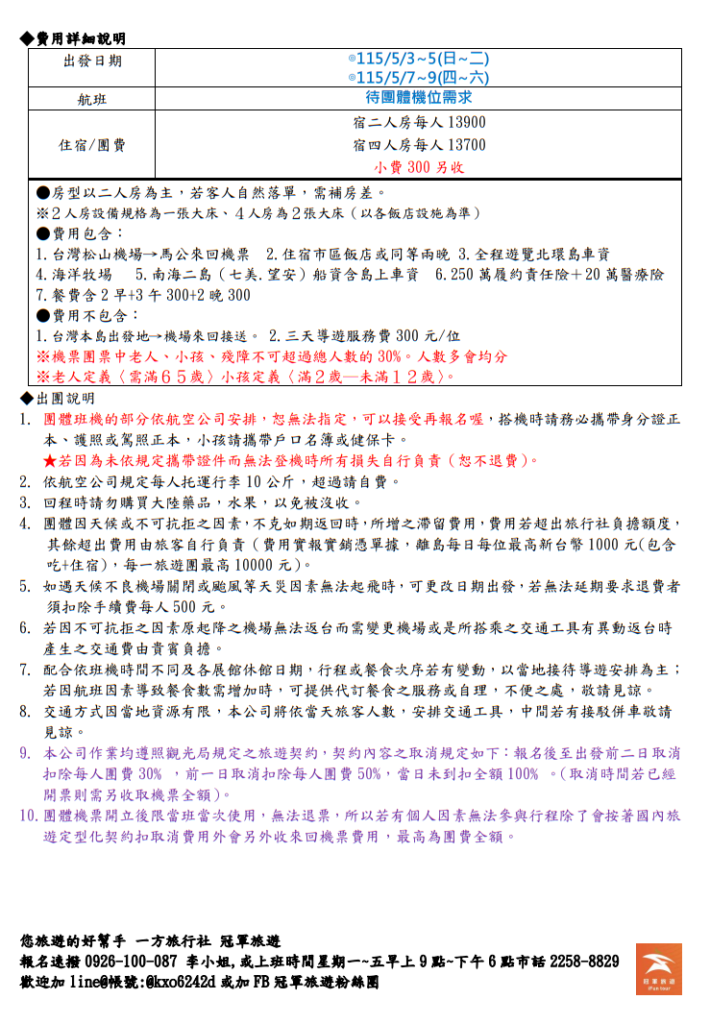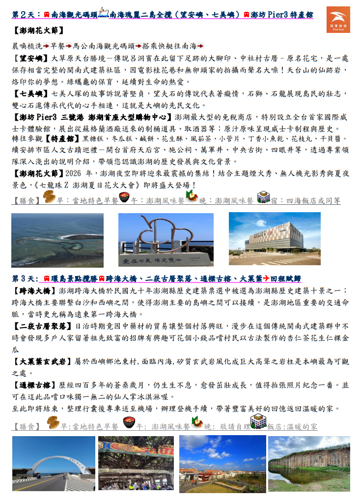 115年澎湖花火節三日遊(1/28更新) 冠軍旅遊 2026澎湖花火節x七龍珠 七美、望安、摩西分海、海洋牧場三日遊 第一梯次:115/5/3~5(日~二) 第二梯次:115/5/7~9(四~六) 3/10前(報名+付訂)享早鳥優惠一位少200元
