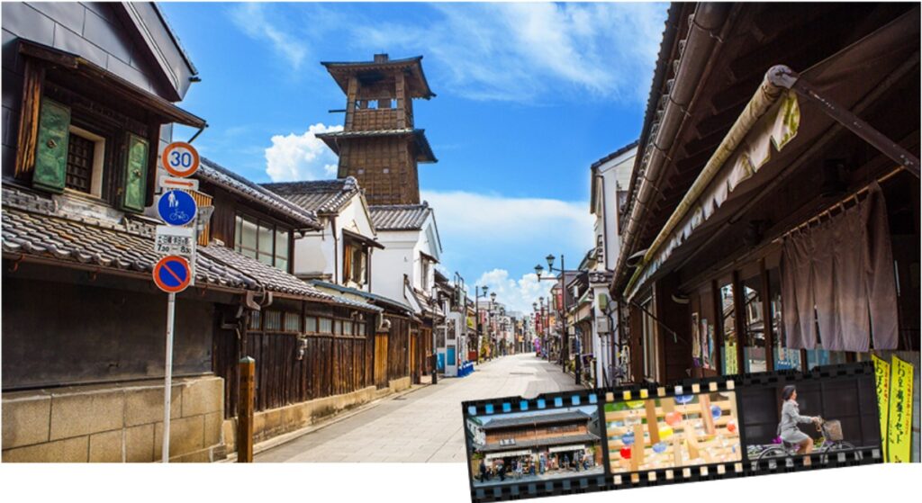 在江戶時代是川越藩的城下町,非常繁榮,有「小江戶」之稱。這邊有著250年以上古街道,為日本保留最完整明治時代的建築,國家指定保護的古蹟,街道旁造酒廠、鐘樓、郵局林立及和菓子店等。您可漫步於古街道上細細品味日本古風。