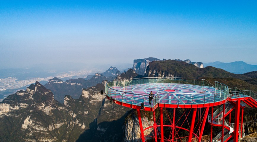 整個觀景台全部用鋼化玻璃鋪墊。觀景台為圓形,面積20 0平方米,向東可望見天門山,向西可看熊壁岩,正前方則是美麗張家界市區。