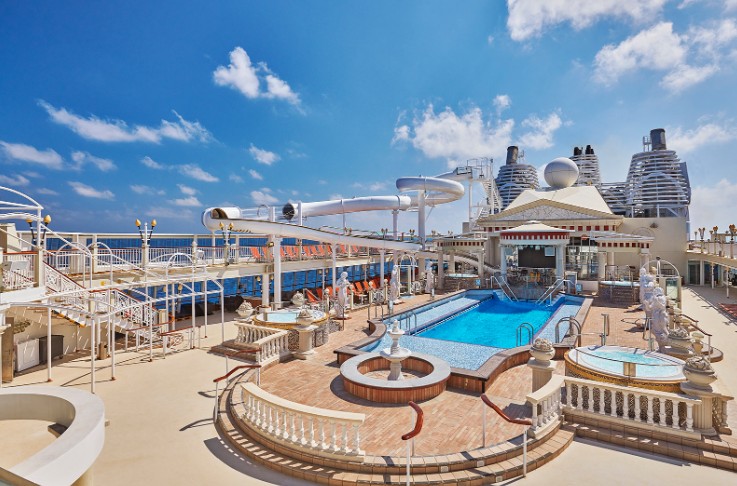 羅馬泳池: 您可以在我們以羅馬為主題的户外泳池甲板上暢遊,那裡設有凱撒滑梯、熱水浴缸和現場樂隊表演的舞台。